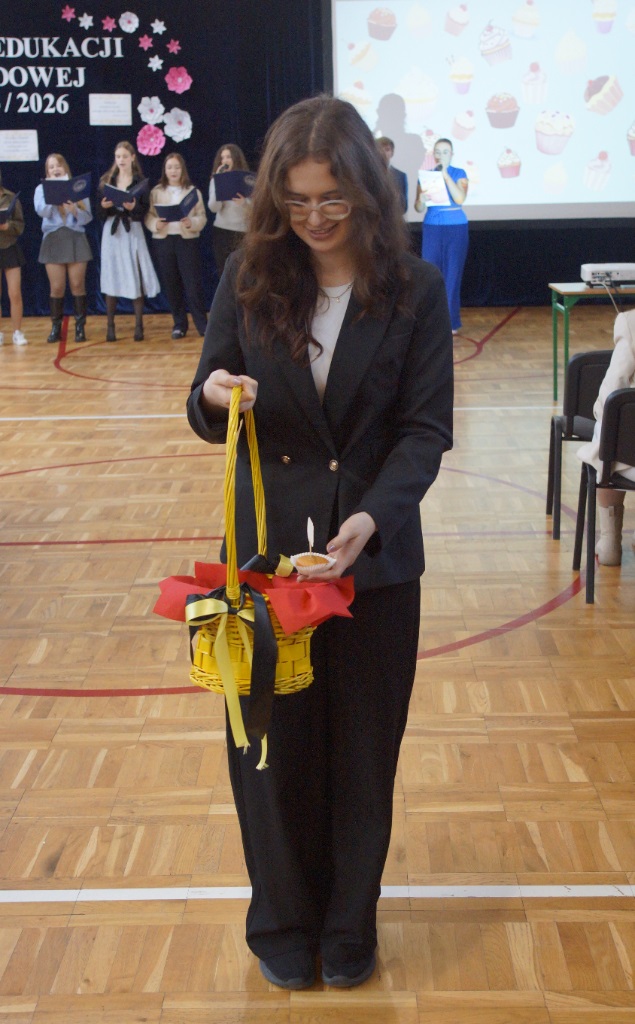 Przewodniczący samorządu uczniowskiego przekazał nauczycielom i pracownikom szkoły serdeczne podziękowania w imieniu całej społeczności szkolnej, a uczennice klasy 2AR wręczyły im słodki upominek.