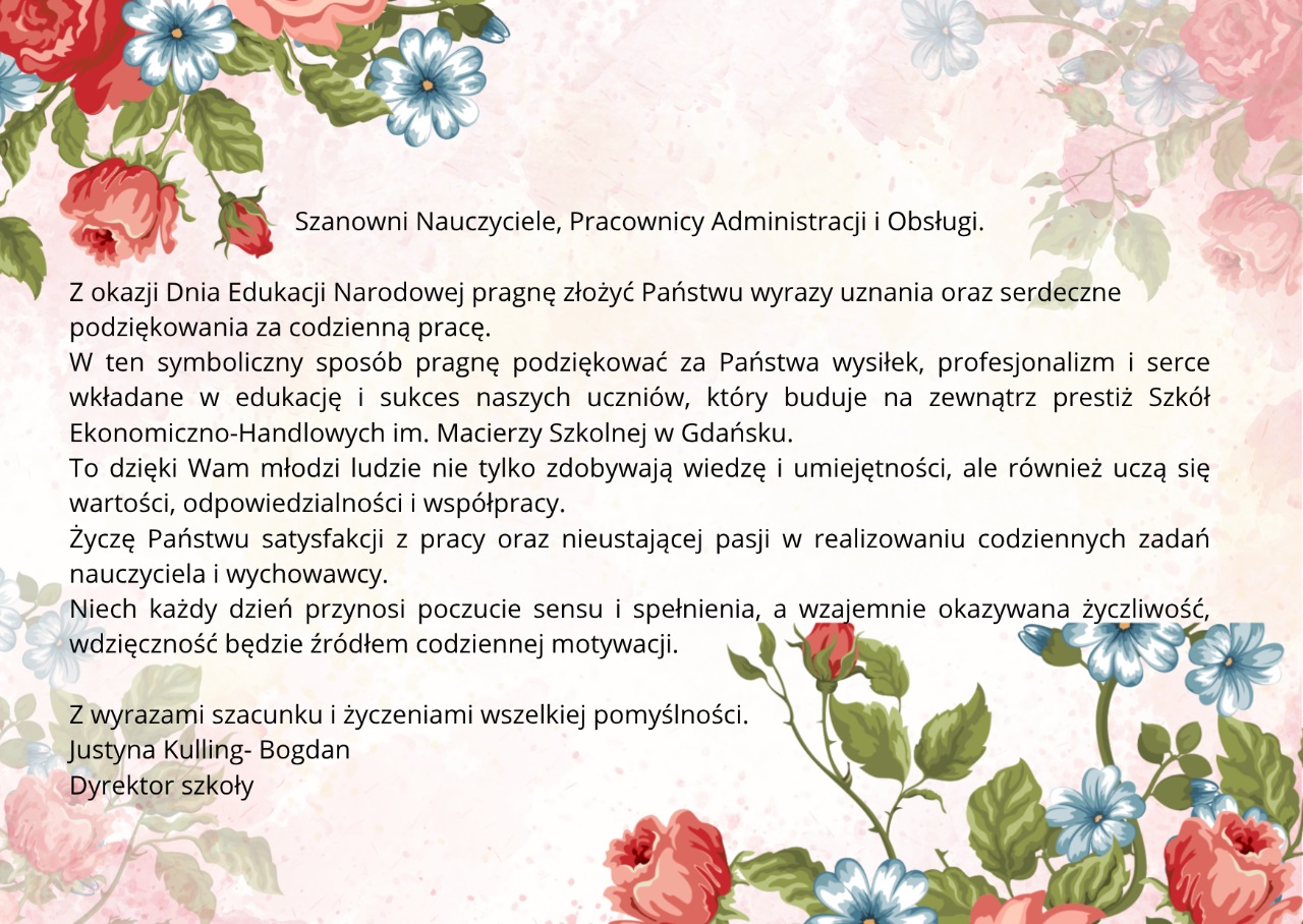 Z okazji Dnia Edukacji Narodowej pragnę złożyć Państwu wyrazy uznania oraz serdeczne podziękowania za codzienną pracę.